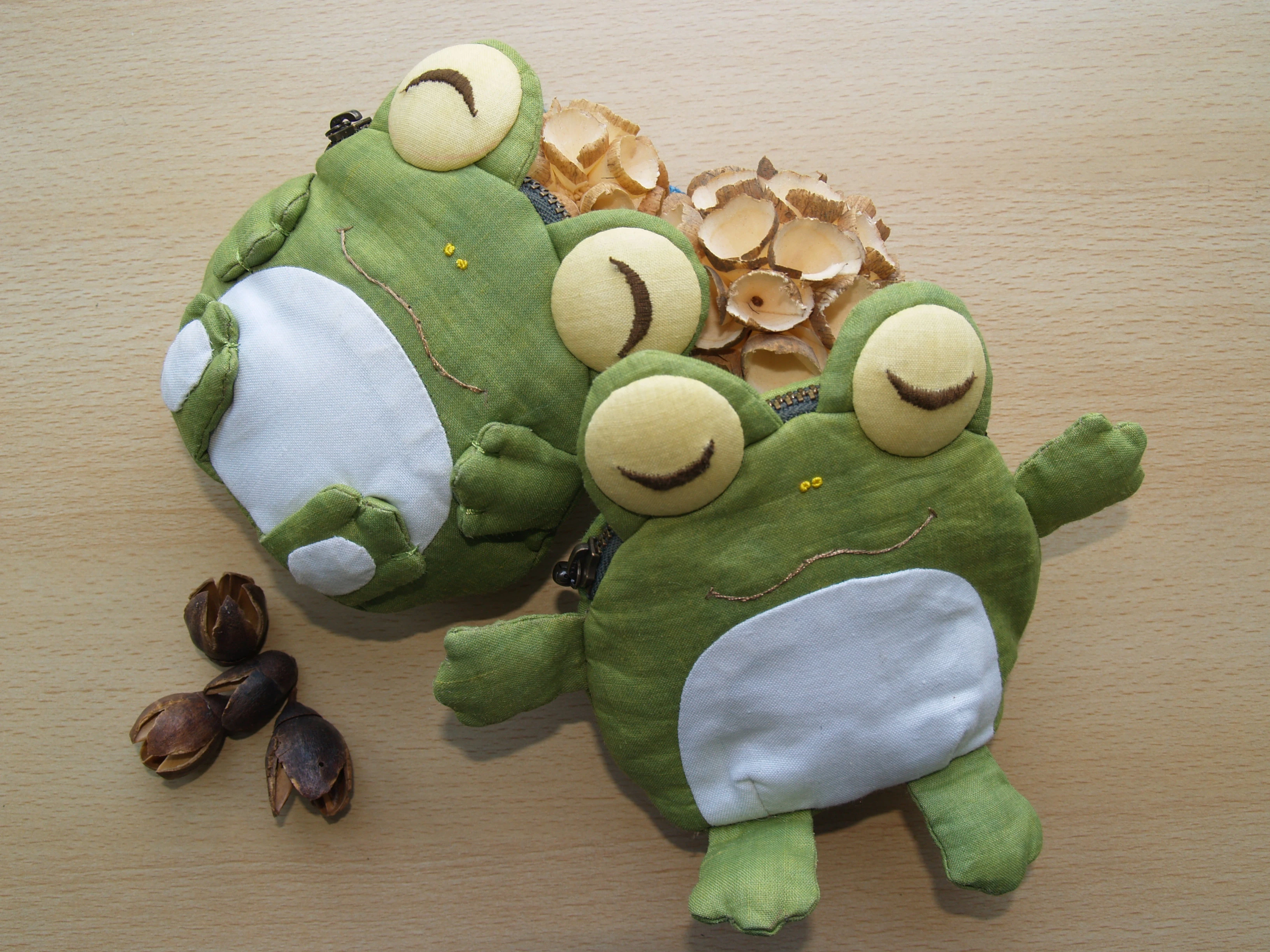 樹蛙零錢包採素染與雲染兩種方式進行,手染布搭配苧麻布織紋路,呈現蛙體既光滑又立體的質感,蛙體從手部、腳部、嘴巴、眼睛等,全手工的繡縫。台北樹蛙以綠色雲染布為設計,眼睛與肚子皆為黃色。